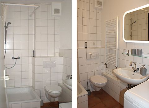 Zur Verfügung stehen eine vollausgestattete Wohnküche mit Geschirrspüler, 2 Schlafzimmer, Duschbad mit Waschmaschine und Zugang zum Garten.